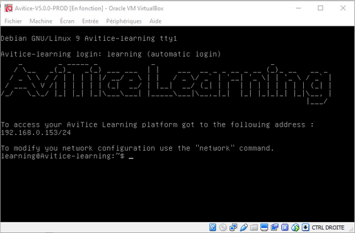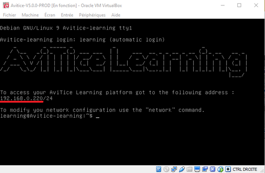Par défaut, la machine virtuelle AviTice Learning est en DHCP. Afin de faciliter l'accès des utilisateurs en fixant l'adresse IP rendez vous sur l'interface de la machine virtuelle (interface générée dans la fenêtre VirtualBox) :